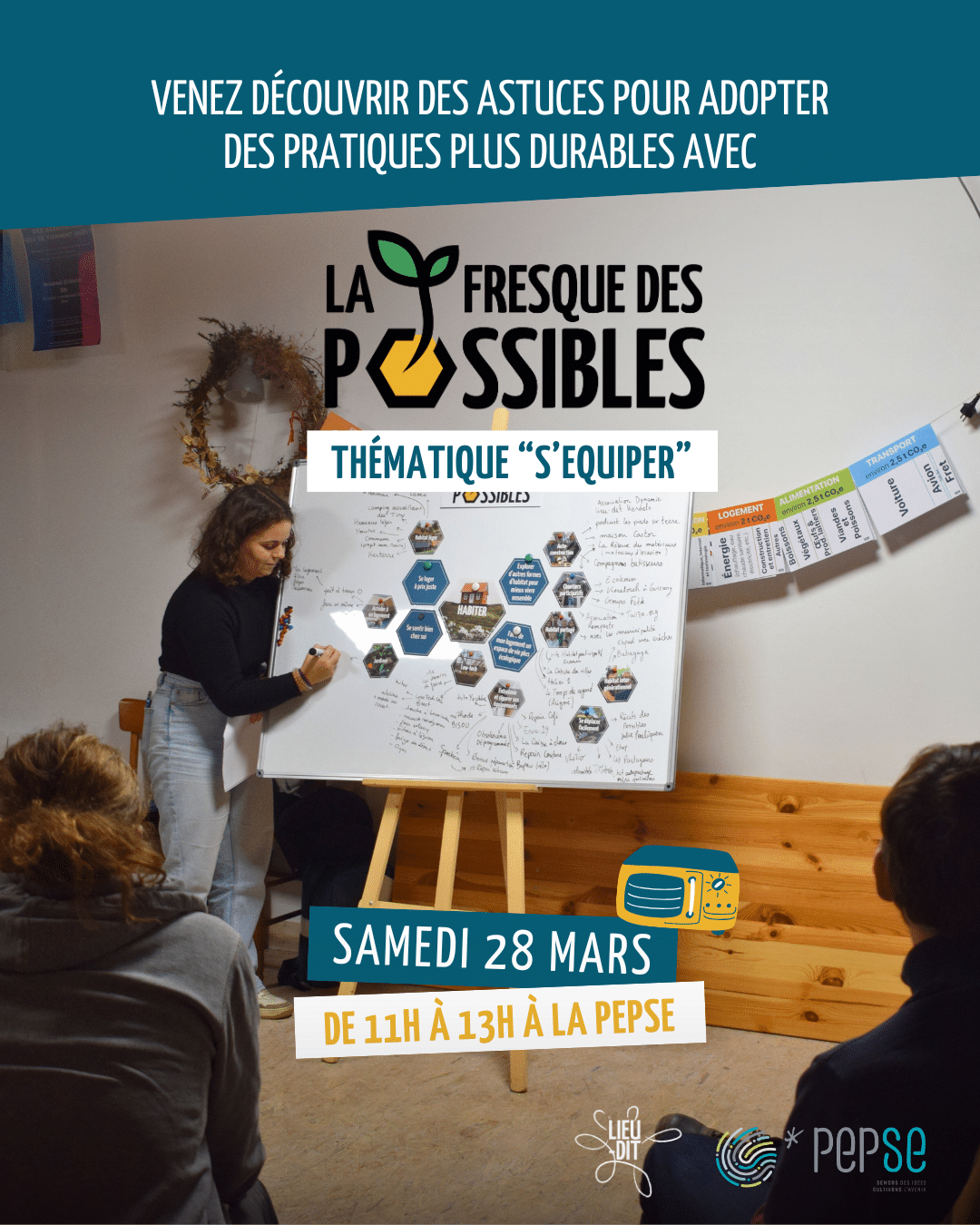 La Fresque des Possibles – “s’équiper” est un atelier participatif qui t’invite à explorer des façons de t’équiper (vêtements, objets, appareils électroniques…) de manière plus durable et solidaire 👕📱. À travers des échanges et des exemples concrets, tu découvriras des solutions simples et adaptées à ton quotidien d’étudiant.