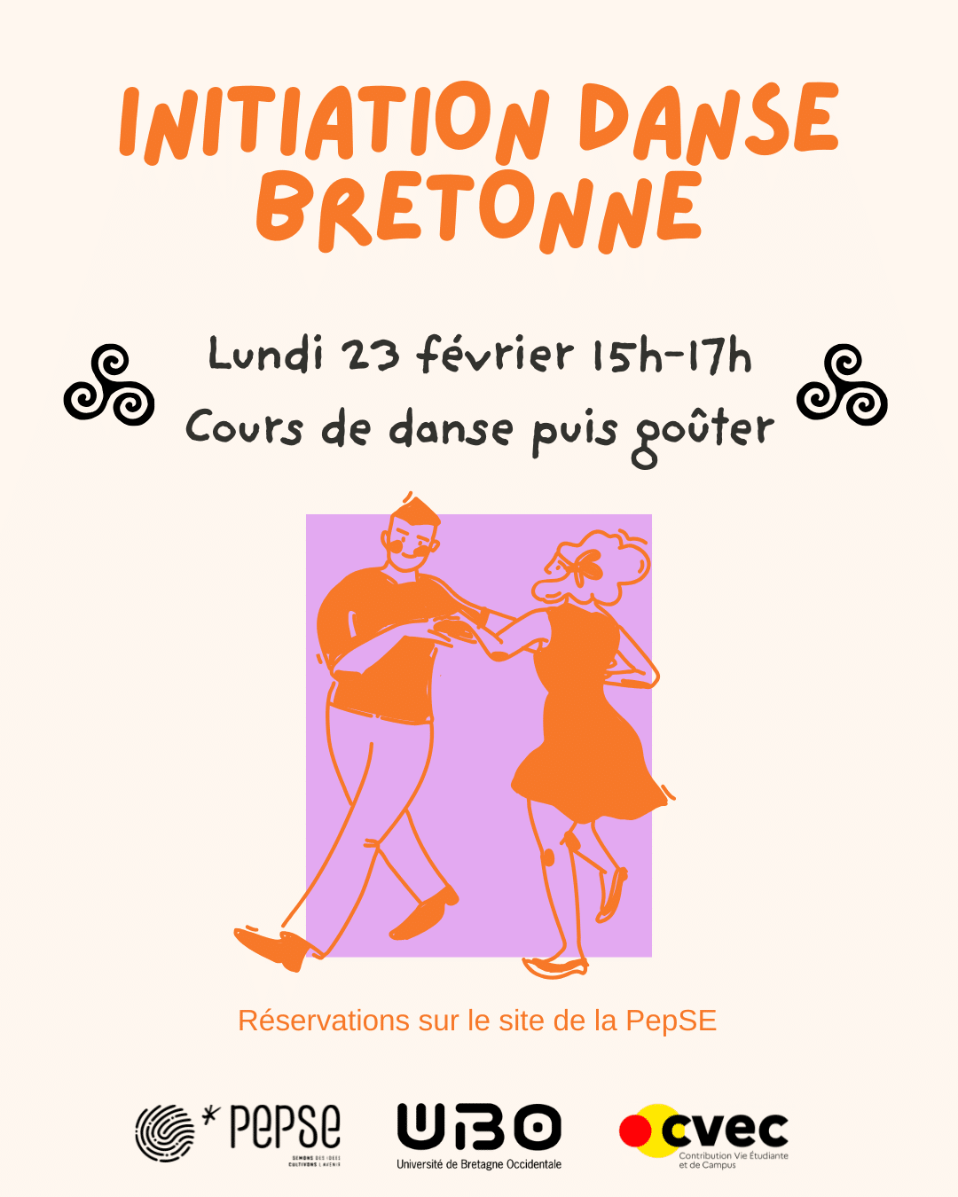 Viens t’initier à la danse bretonne lors d’un atelier ouvert aux étudiantes et aux étudiants, même si tu n’as jamais dansé ! Dans une ambiance conviviale, tu apprendras quelques danses traditionnelles avant de profiter d’un goûter crêpes bien mérité. Un moment chaleureux pour bouger, rencontrer du monde et se régaler 🥞💃