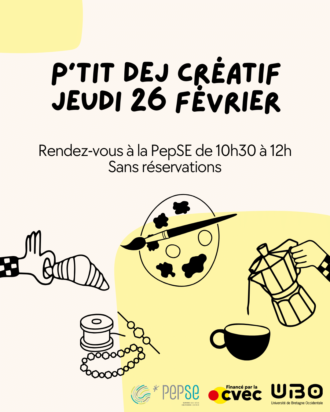 Viens partager un petit-déj créatif, ouvert aux étudiantes et aux étudiants ! Au programme : peinture sur tote bag ou sur verre, création de bijoux en perles, fabrication de badges… Choisis ton activité, laisse libre cours à ton imagination et repars avec tes créations. Un moment convivial, simple et fun pour démarrer la journée ☕🎨✨