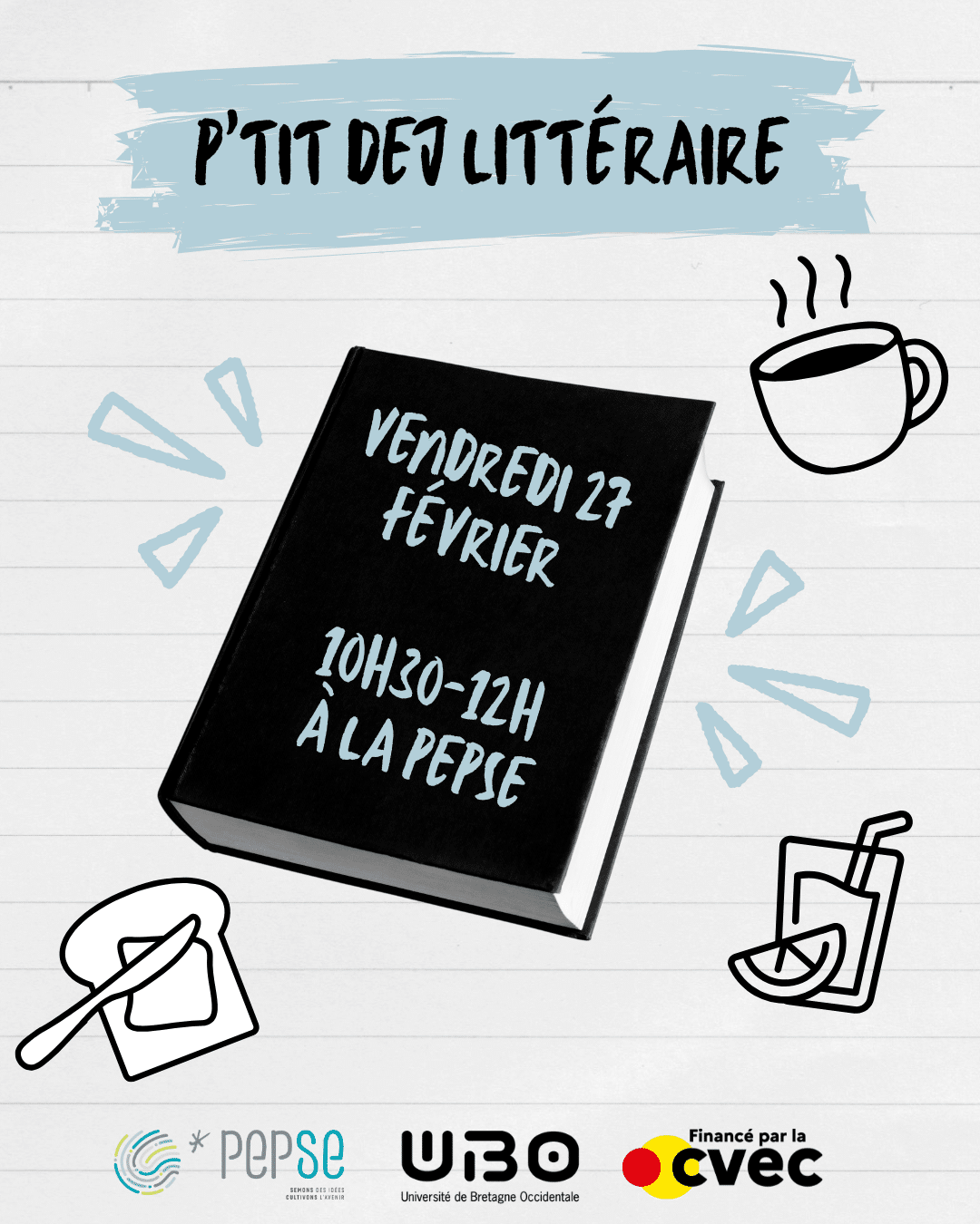 Rejoins-nous pour un p’tit dej littéraire convivial, un moment d’échange et de découverte autour des livres. Que tu sois passionné·e de lecture ou simplement curieux·se, viens partager tes coups de cœur, tes réflexions et tes idées dans une ambiance chaleureuse.