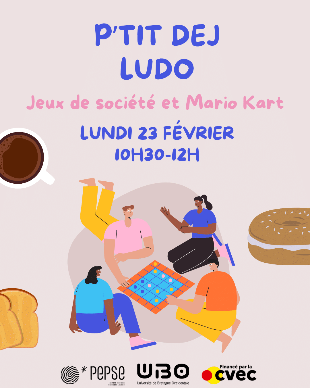 Viens prendre ton petit-déj tout en t’amusant ! Brioche, jus de fruits, café/thé et jeux de société t’attendent, et pour les plus compétitifs, Mario Kartest là pour pimenter la matinée ☕🎮 On mange, on discute, on joue, et on s’amuse dans une ambiance sympa et décontractée !