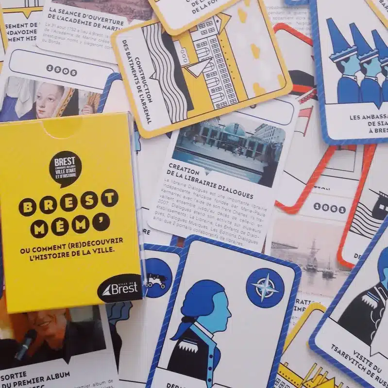 Brest Mem’, jeu édité à la demande de la Ville de Brest par Croc Jeux Editions pour célébrer sa labellisation Ville d’art et d’histoire, propose de vous mettre à l’épreuve sur vos connaissances ; lieux emblématiques, personnages historiques, événements marquants, toute l’histoire de Brest est condensée dans ce jeu !