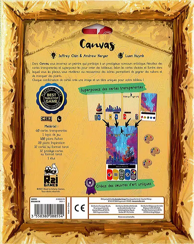 Dans Canvas, vous incarnez un peintre en compétition dans un concours d’art. Collectionnez des cartes d’art, en en superposant 3 pour créer votre propre œuvre unique. En fonction de la manière dont vous superposerez les cartes, vous révélerez certaines icônes qui seront utilisées en fin de partie.
