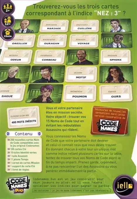 Codenames Duo est un jeu coopératif pour 2 joueurs (ou plus) dans lequel vous devez retrouver tous vos Noms de Code avant la fin du temps imparti. Pour cela, vous devez, tour à tour, deviner ou faire deviner vos Noms de Code en donnant le meilleur indice possible. Prenez garde à ne pas tomber sur les redoutables Assassins qui rôdent !