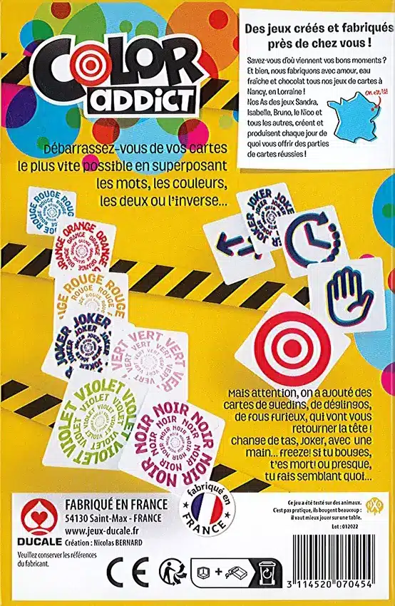 En famille, entre amis, au bureau, à l’école ou avec Mamie, vous allez en voir de toutes les couleurs. Débarrassez-vous de vos cartes le plus vite possible en superposant les mots, les couleurs, les deux ou l’inverse !