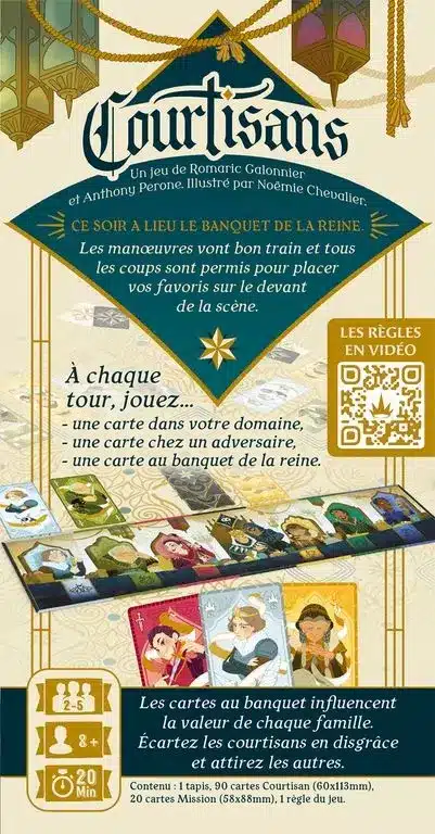 Courtisans est un jeu de cartes et de collection pour 2 à 5 joueurs. Dans ce jeu de société, vous allez placer des cartes Courtisans devant vous, chez vos adversaires et à la table de la Reine afin d’influencer les valeurs de chaque clan. Pour obtenir le plus de points et l’emporter, vous devrez collectionner les bonnes familles tout en préservant leur valeur à la table de la reine.