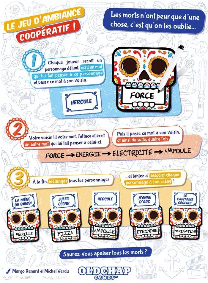 Choisissez un mot pour décrire votre personnage défunt, mais attention ce mot va passer de main en main, et se modifier peu à peu… Parviendrez-vous à retrouver votre personnage et celui des autres joueurs ?