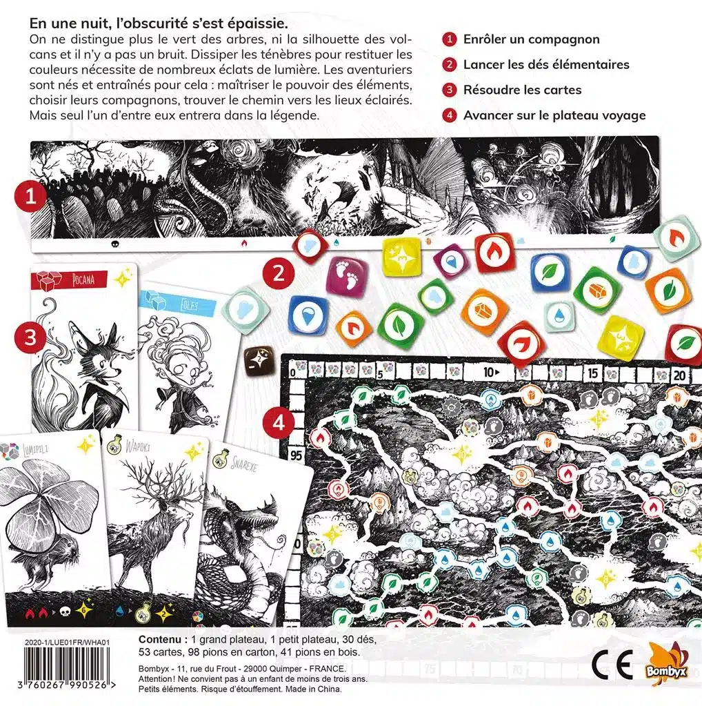 Lueur se déroule au long des huit journées qui composent la partie, enrôlez huit compagnons pour constituer peu à peu votre compagnie. Leurs effets, liés aux éléments et activés selon le résultat de vos dés, vous apporteront la majorité des éclats de lumière. Avancez ensuite à la recherche de villages éclairés. Celui qui récoltera le plus d’éclats de lumière dissipera les ténèbres et inscrira son nom dans les textes anciens.