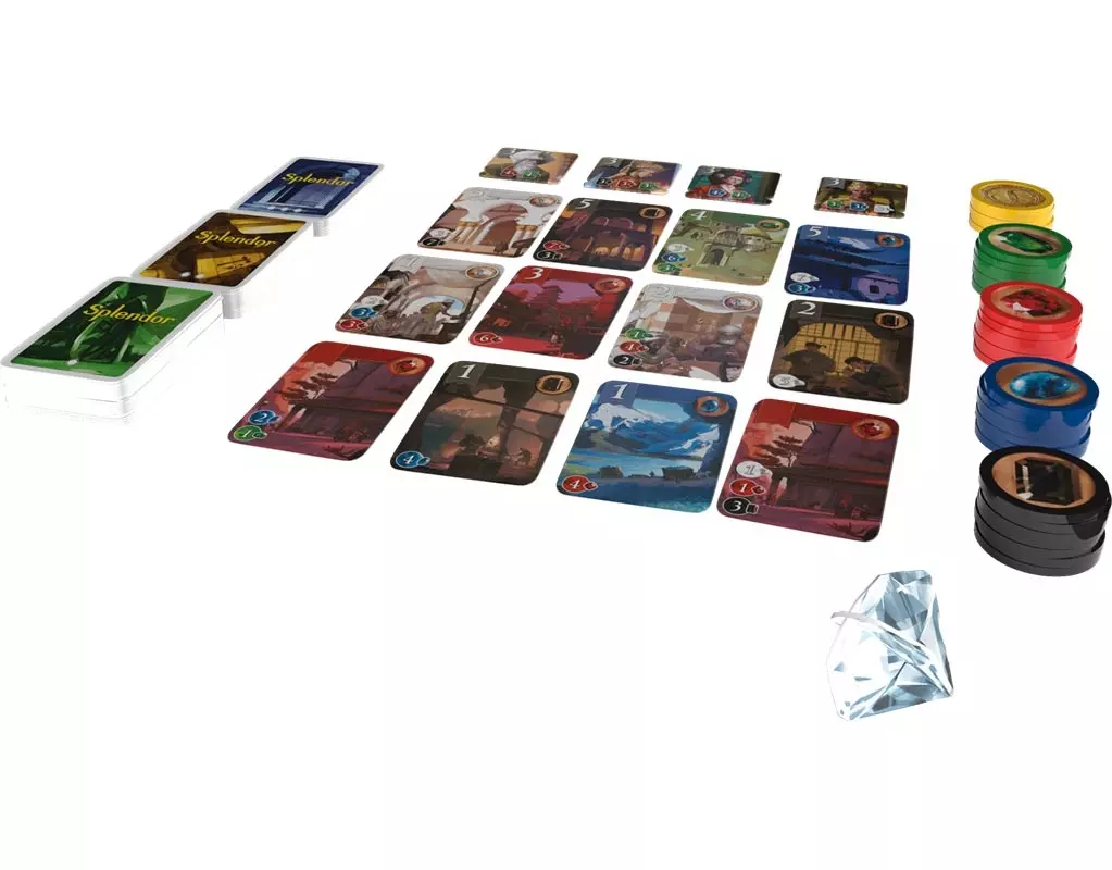 Dans le jeu Splendor, vous utilisez vos ressources pour acquérir des mines, des moyens de transport et des artisans qui vous permettront de transformer des pierres brutes en magnifiques bijoux.