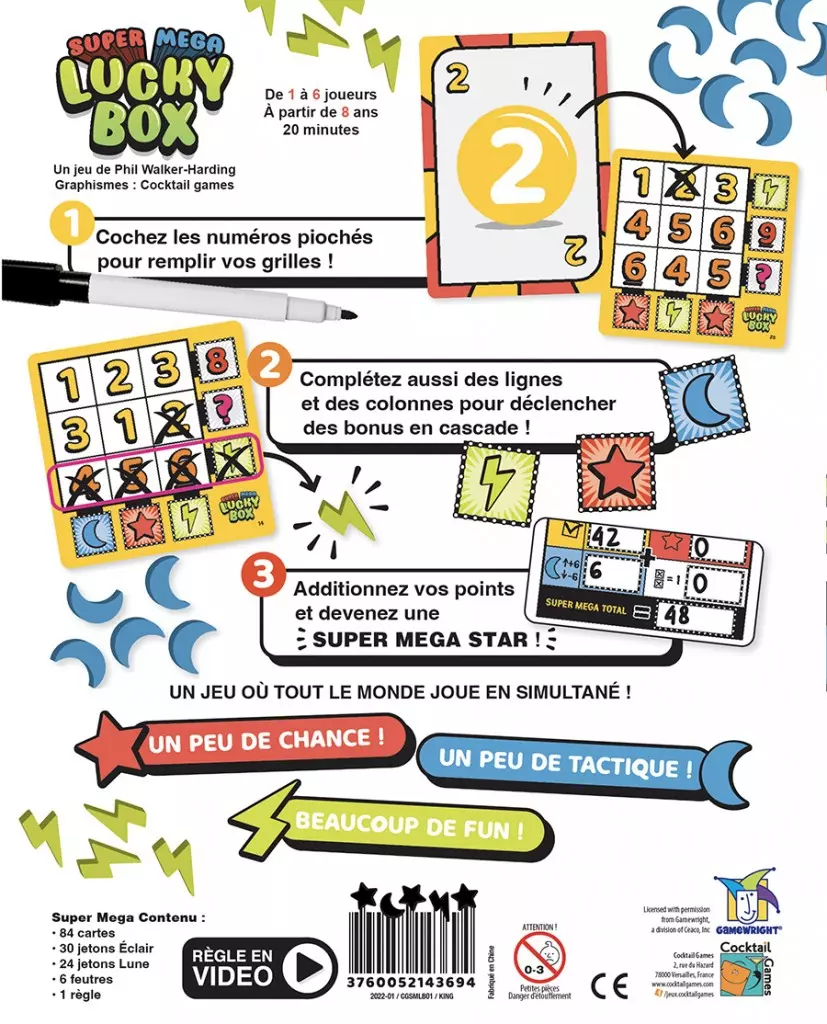 Super Méga Lucky Box est un jeu d’ambiance et de combinaison pour 1 à 6 joueurs.