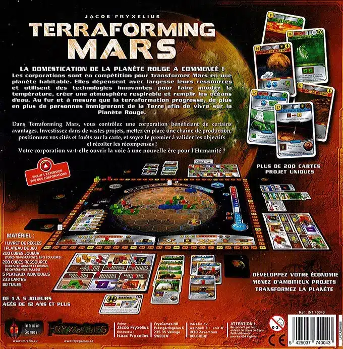 Dans le jeu Terraforming Mars, les corporations sont en compétition pour transformer Mars en une planète habitable. Elles dépensent avec largesse leurs ressources et utilisent des technologies innovantes pour faire monter la température, créer une atmosphère respirable et remplir les océans d’eau. Au fur et à mesure que la terraformation progresse, de plus en plus de personnes immigreront depuis la Terre afin de peupler la planète rouge.