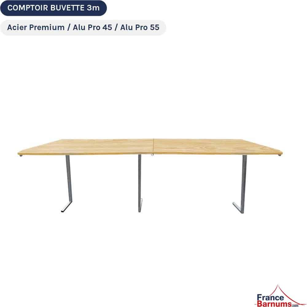 Le montage du comptoir est simple et rapide : dépliez le plateau et les pieds de la table, fixez les connecteurs aux pieds de votre barnum pliant puis clipsez les encoches du plateau dans les connecteurs