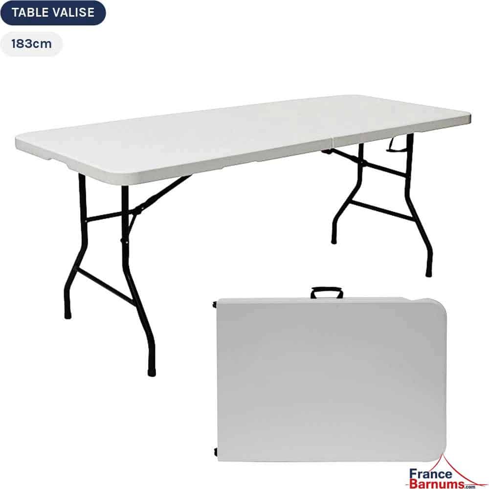 Table pliante de 183cm de longueur, 33cm de largeur et 43cm de hauteur. Transport en mode valise